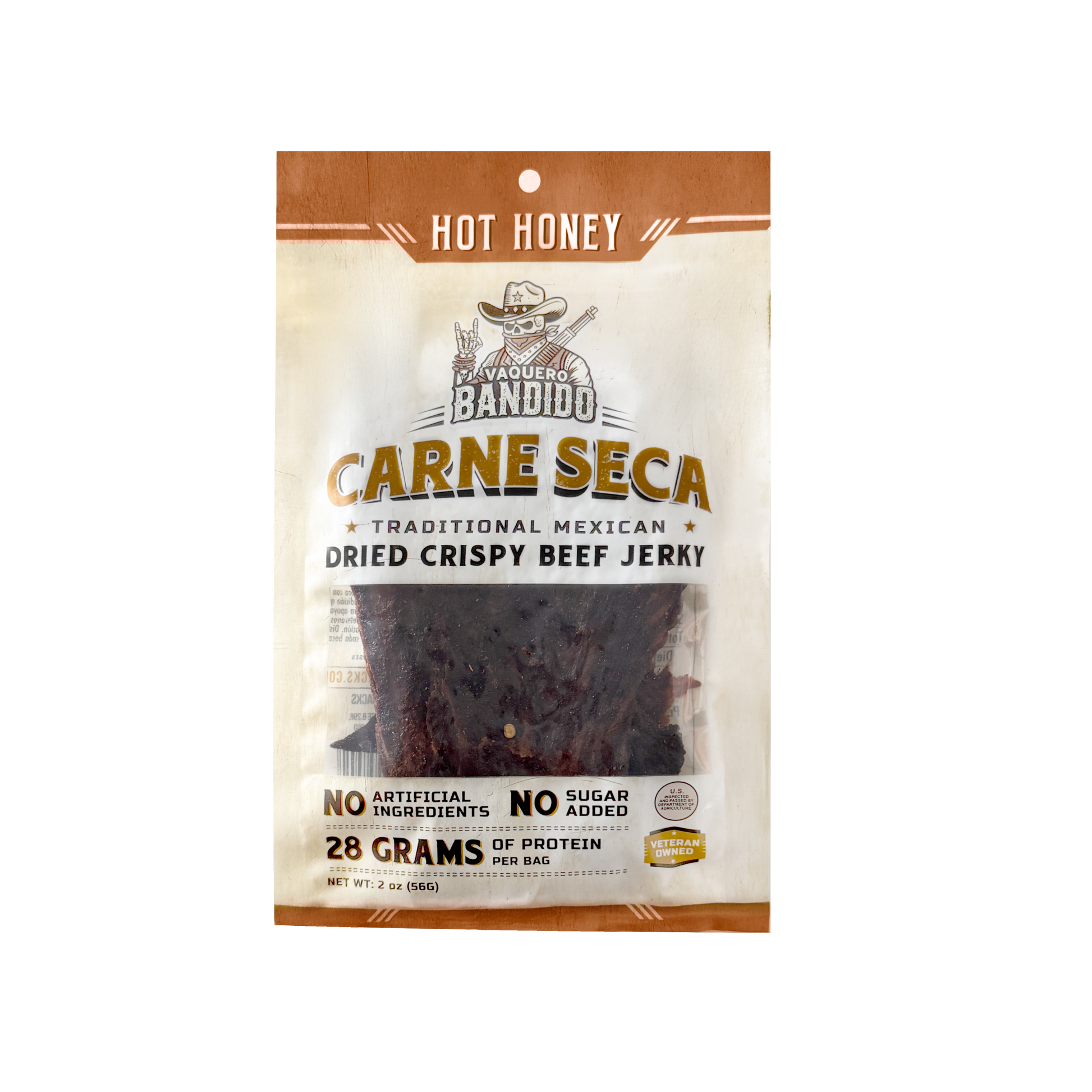 Our new Hot Honey Carne Seca is a delicious mix of sweet and heat, layered over our signature crispy beef jerky made with real ingredients.